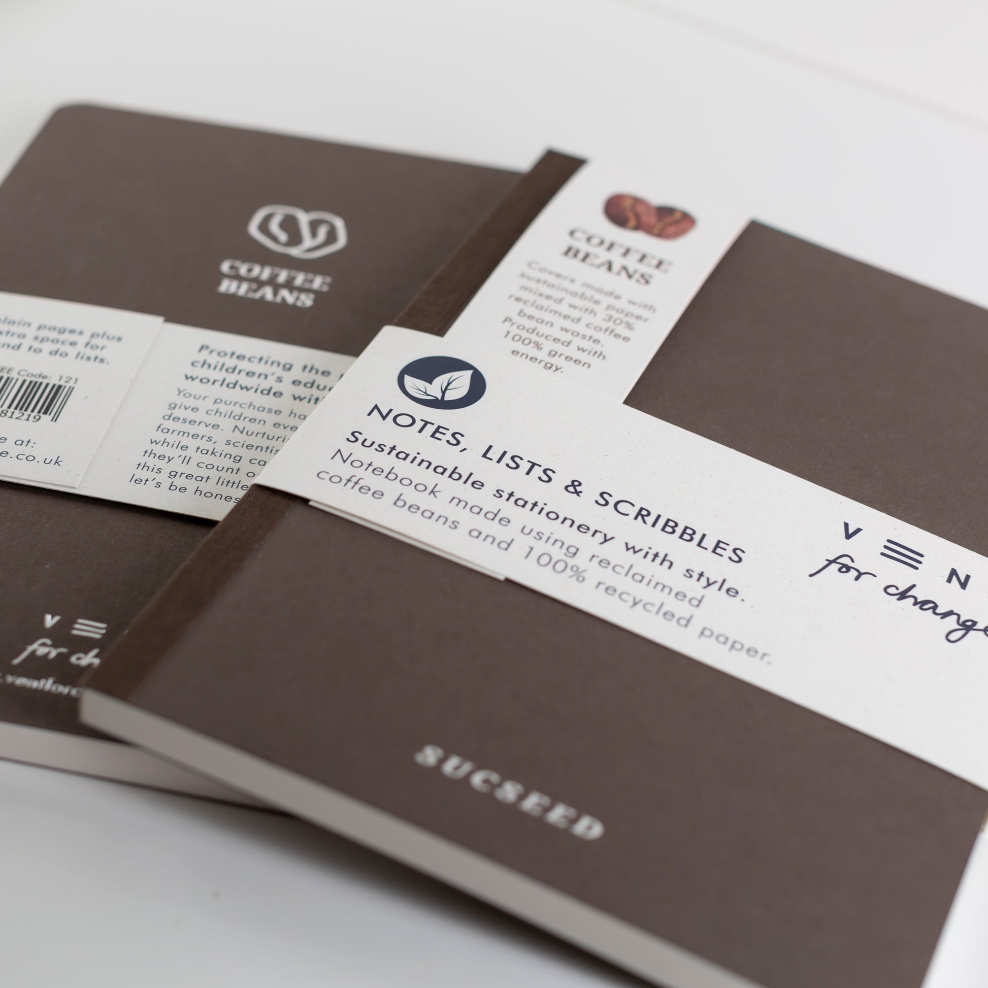 Recycled SUCSEED A6 Notebook Coffee - Cover made using reclaimed coffee beans mixed with recycled paper. Lined, plain and numbered notes throughout.