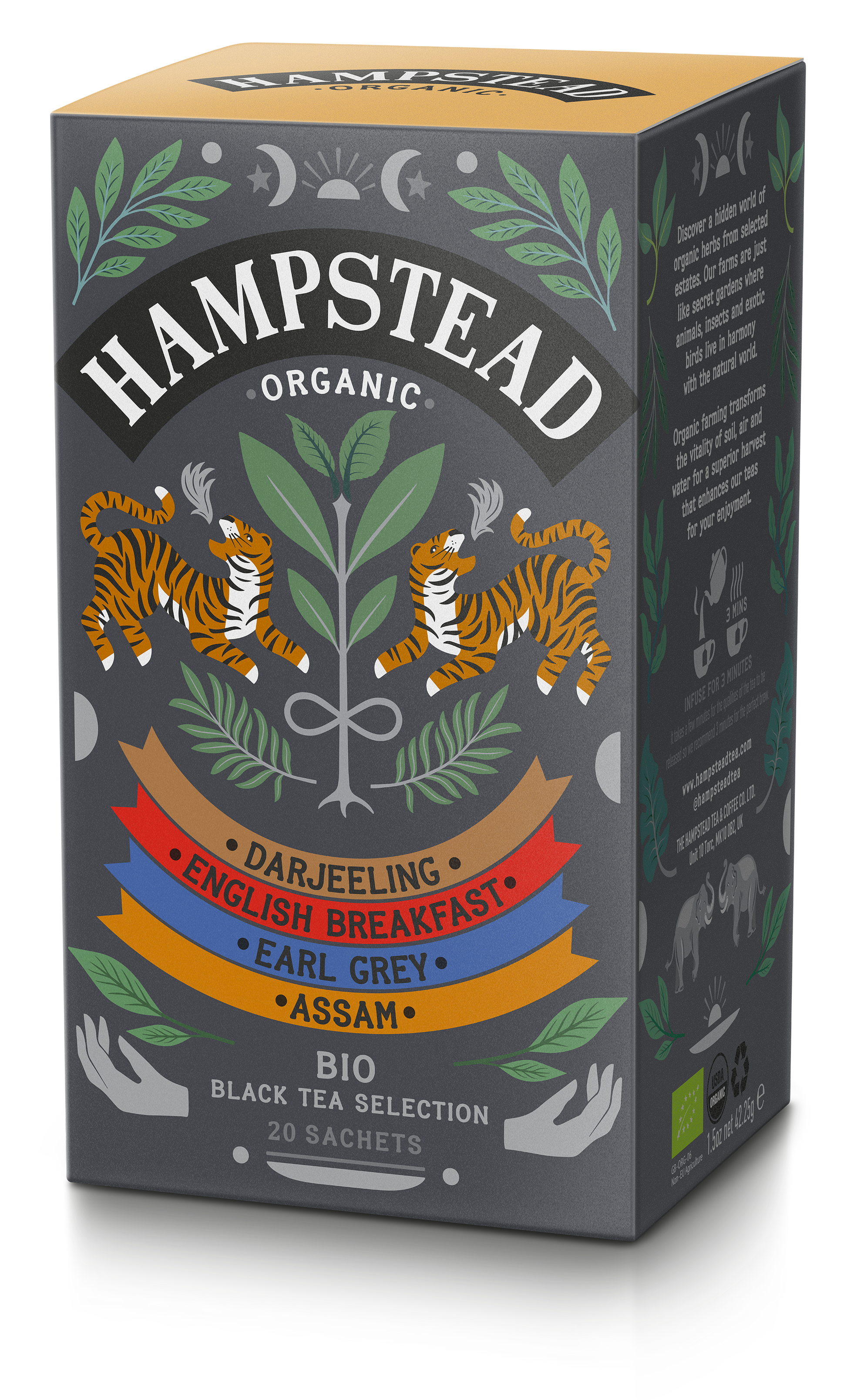 Hampstead Black Tea Selection - organic, biodynamic, Fairtrade, compostable tea bags. A selection of Assam, Darjeeling, Earl Grey and English Breakfast.